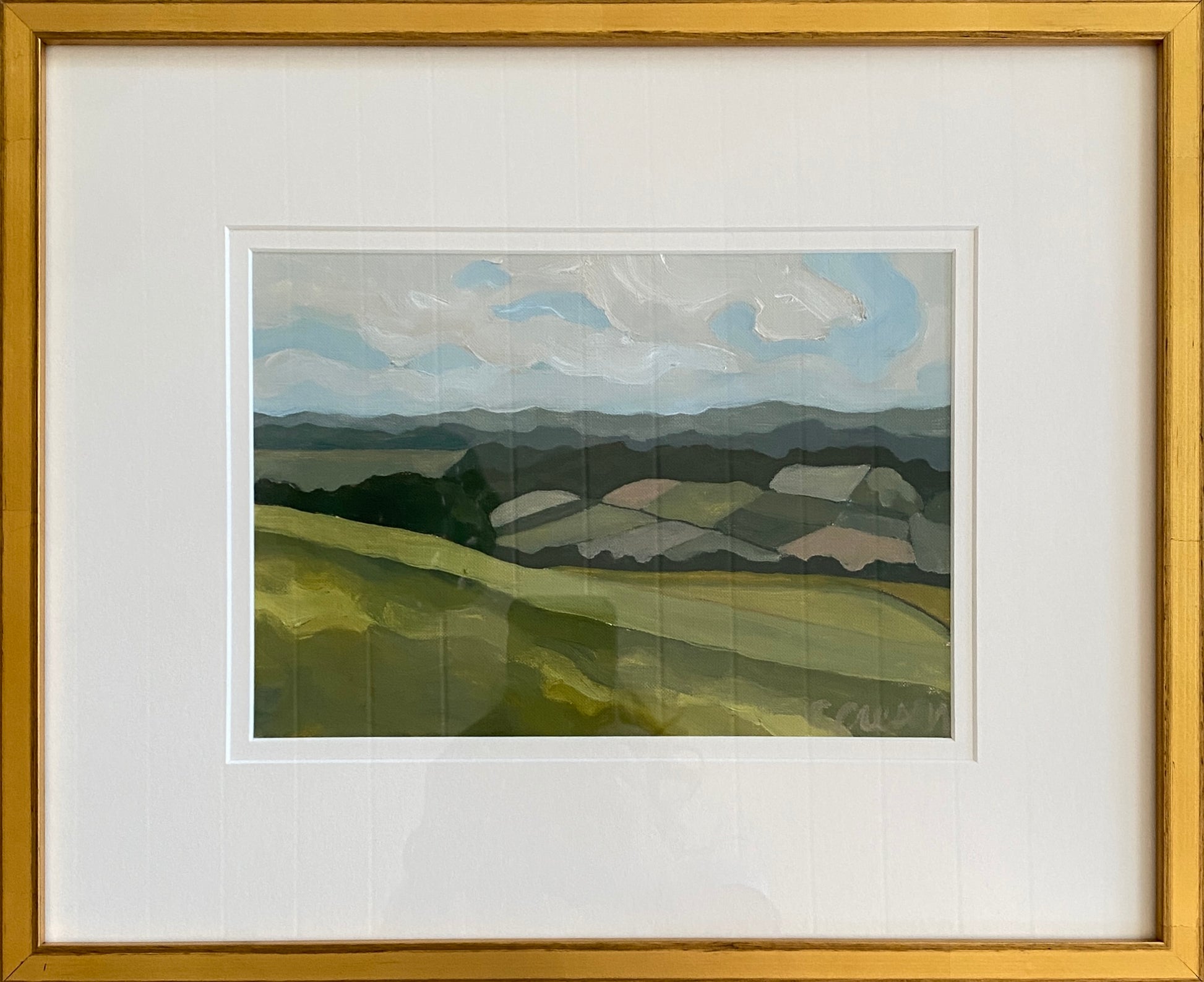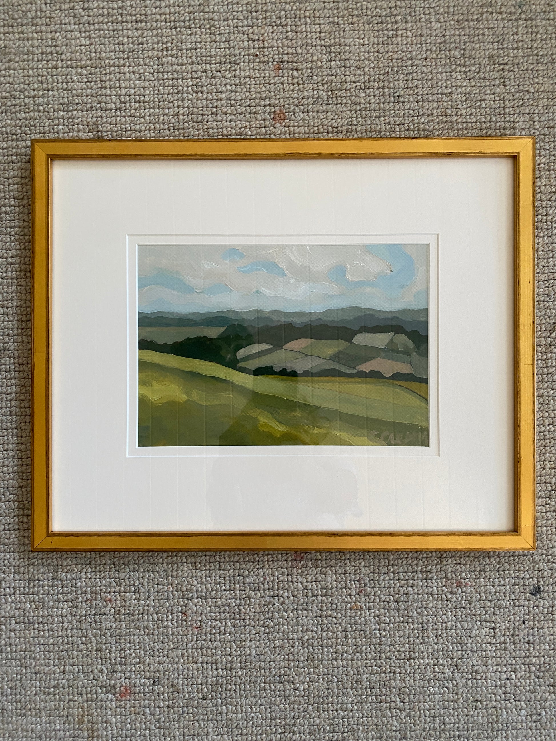 Original, signed oil painting on paper, framed in ivory mat and gold frame to size 15" x 17".
